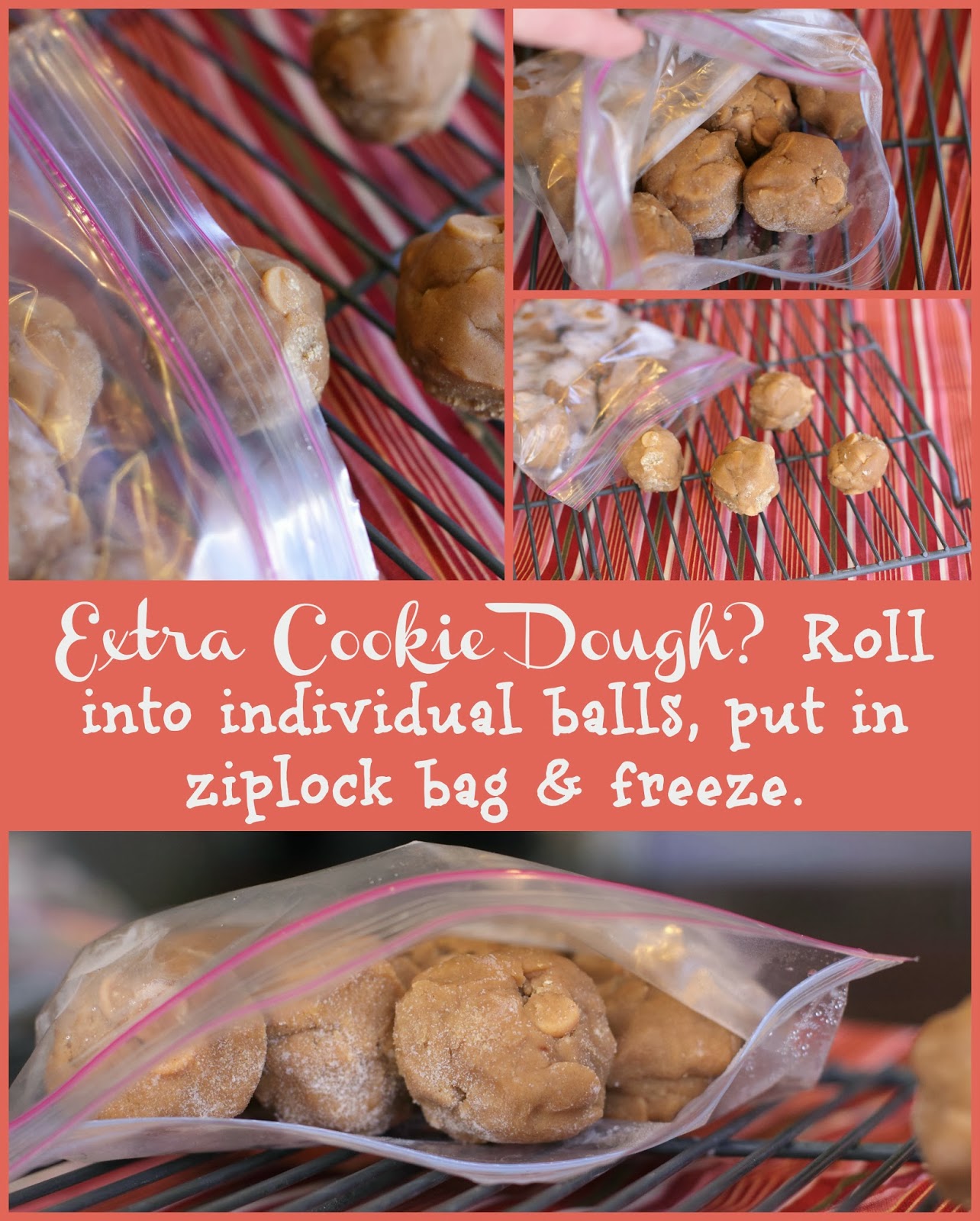 Heres a great tip: What to enjoy a sweet treat but you don’t need 4 dozen? Roll the extra cookie dough into individual balls and freeze them in a ziplock bag. Then each time you want a treat, you can grab a couple of cookie dough balls and cook the exact amount you want!